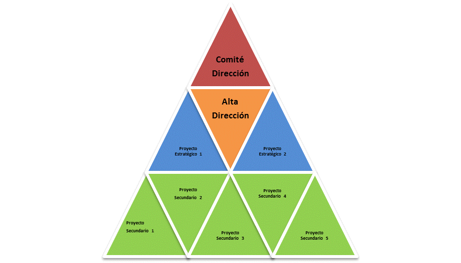 Quizás una pirámide no represente exactamente el modelo organizativo que deberíamos de implantar, ya que dentro de cada pirámide debería de haber otra pirámide designando la función en cada proyecto.