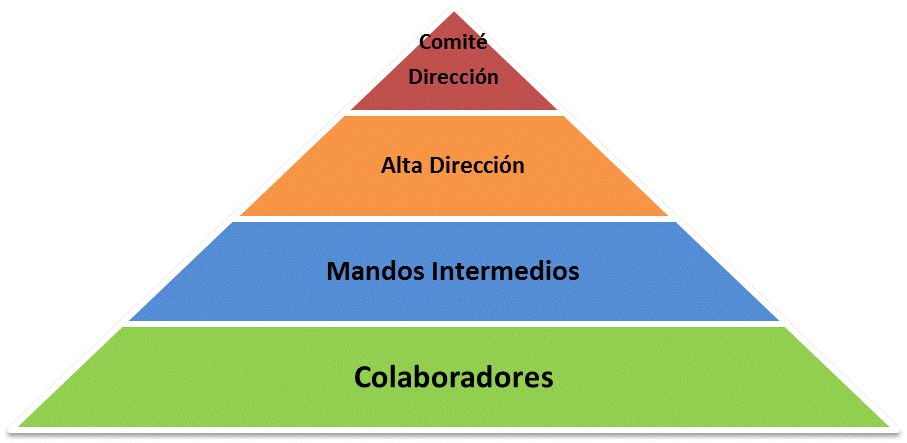 Si quieres conocer en qué nivel te encuentras, es muy sencillo, si solo hay uno como tu en la organización de tu empresa, te puedes etiquetar como Alta Dirección. El resto de personas que gestionan personas son Mandos Intermedios. Las personas técnicas sin equipo, podemos indicar que están en la base de pirámide, lo que denomino como colaboradores.
